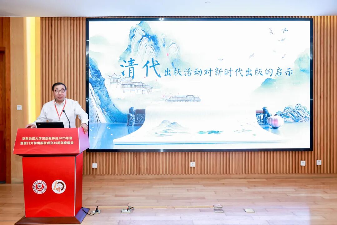 彭水军随后作了题为《厦门大学出版社40周年发展报告》的主题发言。他深情回顾了出版社自1985年成立以来,扎根厦门大学学术沃土,在学术出版、教材建设、文化传承等方面走过的四十年峥嵘岁月与取得的辉煌成就,并对未来发展规划进行了展望。