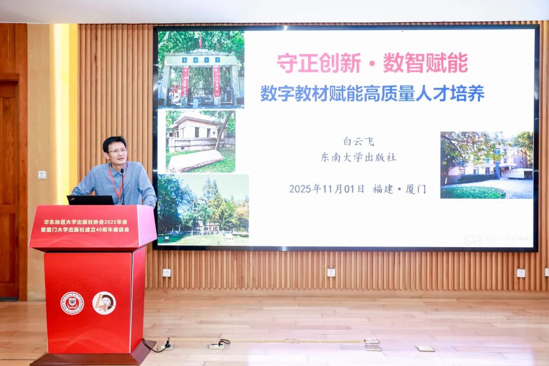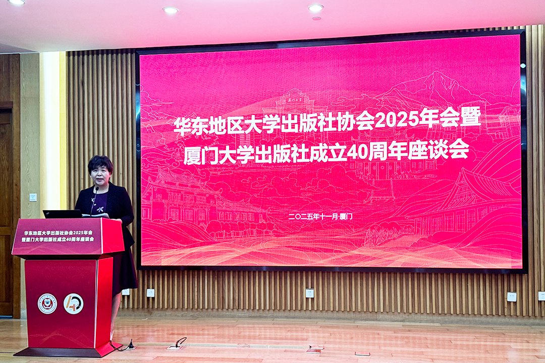 2025年11月1日,由华东地区大学出版社主办、厦门大学出版社承办的“华东地区大学出版社2025年会”在厦门大学思明校区隆重举行。厦门大学党委常委、副校长吴超鹏,中国大学出版社协会秘书长代根兴,华东地区大学出版社理事长、华东师范大学出版社董事长王焰出席活动并致辞,厦门大学出版社社长彭水军作厦门大学出版社四十周年发展报告。本次年会适逢厦门大学出版社建社40周年,来自厦门大学、中国大学出版社协会、厦门外图集团有限公司和华东地区26家大学出版社50余位嘉宾和代表,齐聚一堂,共商发展大计,凝聚发展共识,共同擘画大学出版事业高质量发展蓝图。年会开幕式由厦门大学出版社党总支书记、董事长张伟主持,主旨报告由华东地区大学出版社理事长、华东师范大学出版社董事长王焰主持,分论坛由厦门大学出版社社长彭水军、总编辑施高翔分别主持。