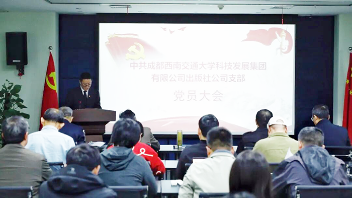11月3日,西南交通大学出版社党支部委员会换届大会在出版社2127会议室举行。西南交通大学科技发展集团有限公司党委书记、董事长陈天利出席会议并讲话。出版社全体正式党员参会,会议由党支部组织委员王建琼主持。