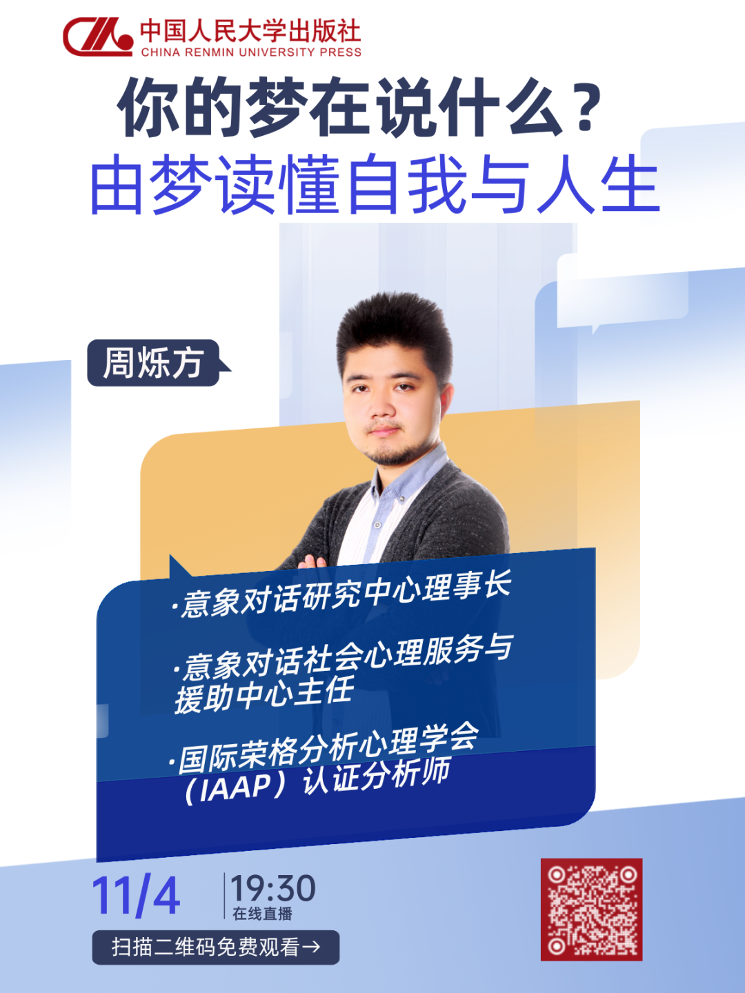 为了能更好地读懂这些来自潜意识的信息,中国人民大学出版社特别邀请到了意象对话研究中心理事长周烁方老师,在11月4日(周二)来到直播间与大家面对面。周老师将从专业的心理学视角,解读梦境背后的情绪与意义,探索如何通过“读懂梦”来更深入地“读懂自己”。