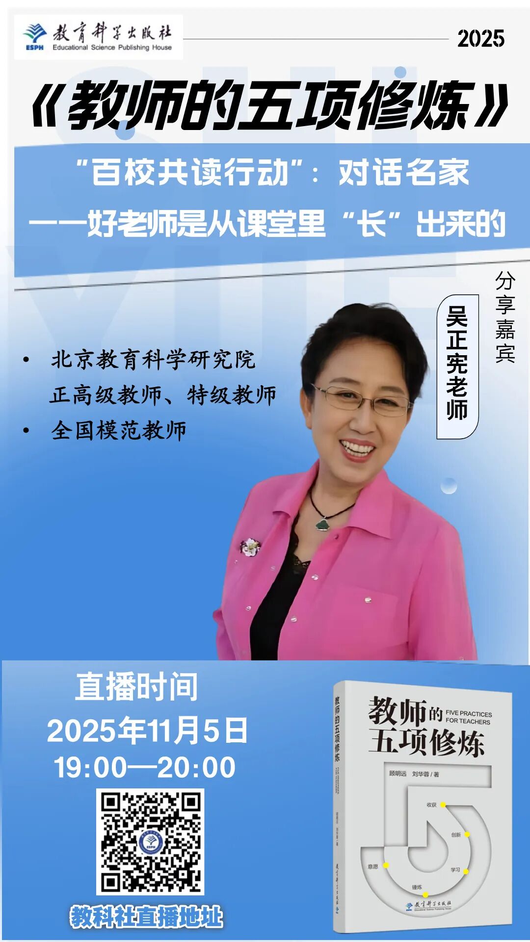 《教师的五项修炼》“百校共读行动”对话名家活动特邀北京教育科学研究院正高级教师、特级教师,全国模范教师——吴正宪老师,与我们共同深入探讨好老师是如何从课堂里“长”出来的。吴老师将结合自身从课堂中成长起来的丰厚积淀,为我们娓娓道来优秀教师的成长路径与核心修炼,并在答疑环节解答观众问题,回应教师心声。