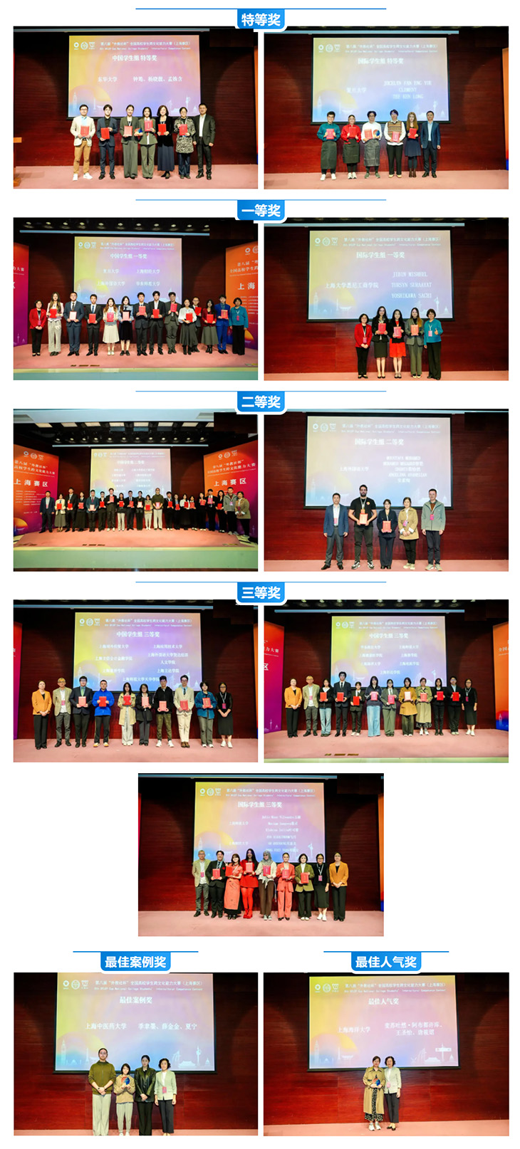 经过一天的激烈角逐,共有15支中国选手队伍晋级决赛,并在赛场上挑战自我,尽显风采,在情境述评、讲述中国故事等环节中展示出良好的语言能力、思维品质、文化素养和协作能力。最终,东华大学代表队脱颖而出,荣获中国学生组特等奖,复旦大学、上海财经大学、上海外国语大学、华东师范大学四支代表队获得一等奖。同时,复旦大学代表队荣获国际学生组特等奖,上海大学悉尼工商学院代表队获得一等奖。