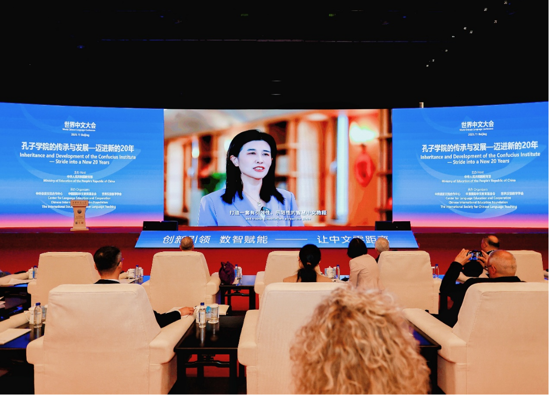 外研社为会议专门制作了《我们是朋友:中文综合教程》宣介短片。外研集团(外研社)党委书记、董事长,外研社社长王芳表示,数智化时代,如何利用好技术工具使中文教育更加智慧、高效、便捷,是很多专家、机构都在思考的问题,外研社一直想要为全球孔院以及所有的中文院校、培训机构打造一套有引领性、示范性的智慧中文教程。