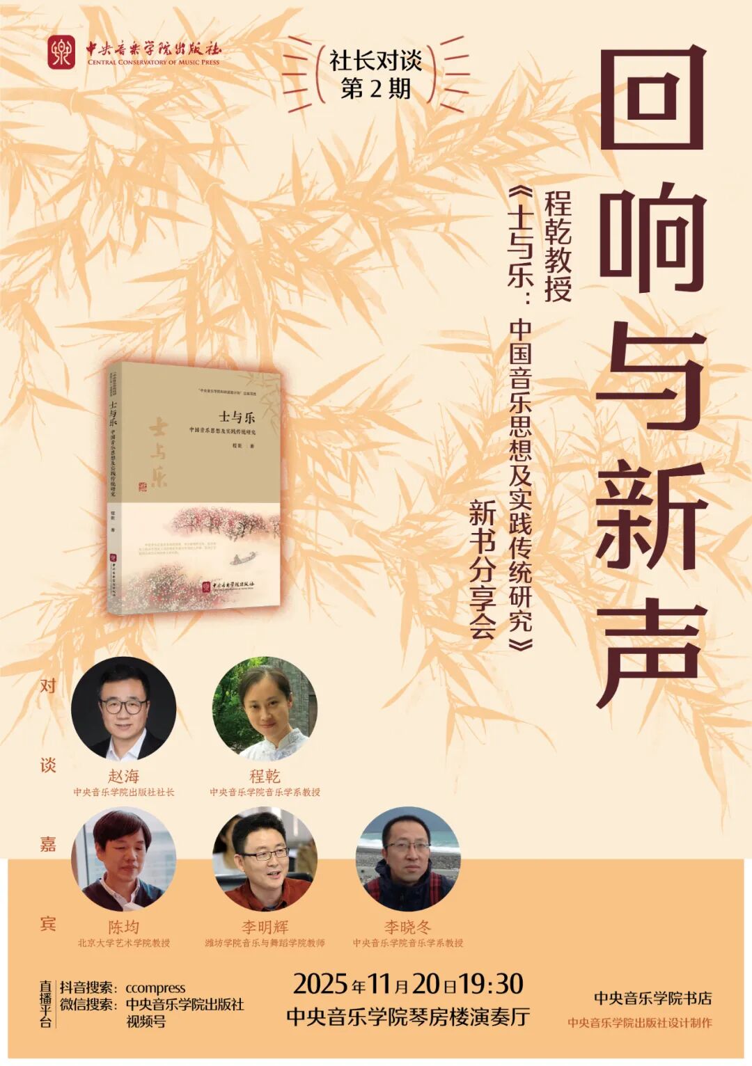 11月20日,中央音乐学院出版社社长赵海将携手中央音乐学院音乐学系教授程乾、李晓冬,北京大学艺术学院教授陈均,潍坊学院李明辉,围绕程乾最新学术力作《士与乐:中国音乐思想及实践传统研究》,以“回响与新声”为主题,展开深度对话。