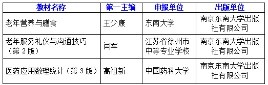 近日,教育部公布了第二批“十四五”职业教育国家规划教材遴选结果。其中,东南大学出版社《老年营养与膳食》《老年服务礼仪与沟通技巧(第2版)》《医药应用数理统计(第3版)》3种教材成功入选“十四五”职业教育国家规划教材名单。
