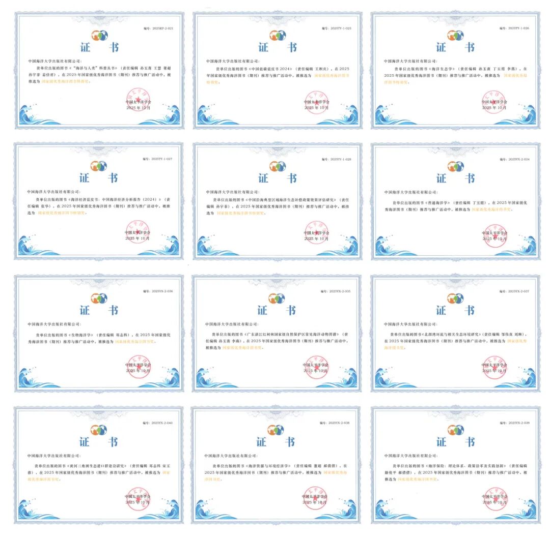 2025年度国家级优秀海洋图书(期刊)推荐与推广活动评选结果正式揭晓,中国海洋大学出版社12种图书入选,涵盖科普、学术研究、政策分析等多个领域,充分彰显了出版社在海洋出版领域的专业实力与社会影响力。其中,《“海洋与人类”科普丛书》荣获国家级优秀海洋图书科普奖,《中国蓝碳蓝皮书2024》《海洋生态学》《海洋经济蓝皮书:中国海洋经济分析报告(2024)》《中国沿海典型区域海洋生态补偿政策效果评估研究》荣获国家级优秀海洋图书特别奖。