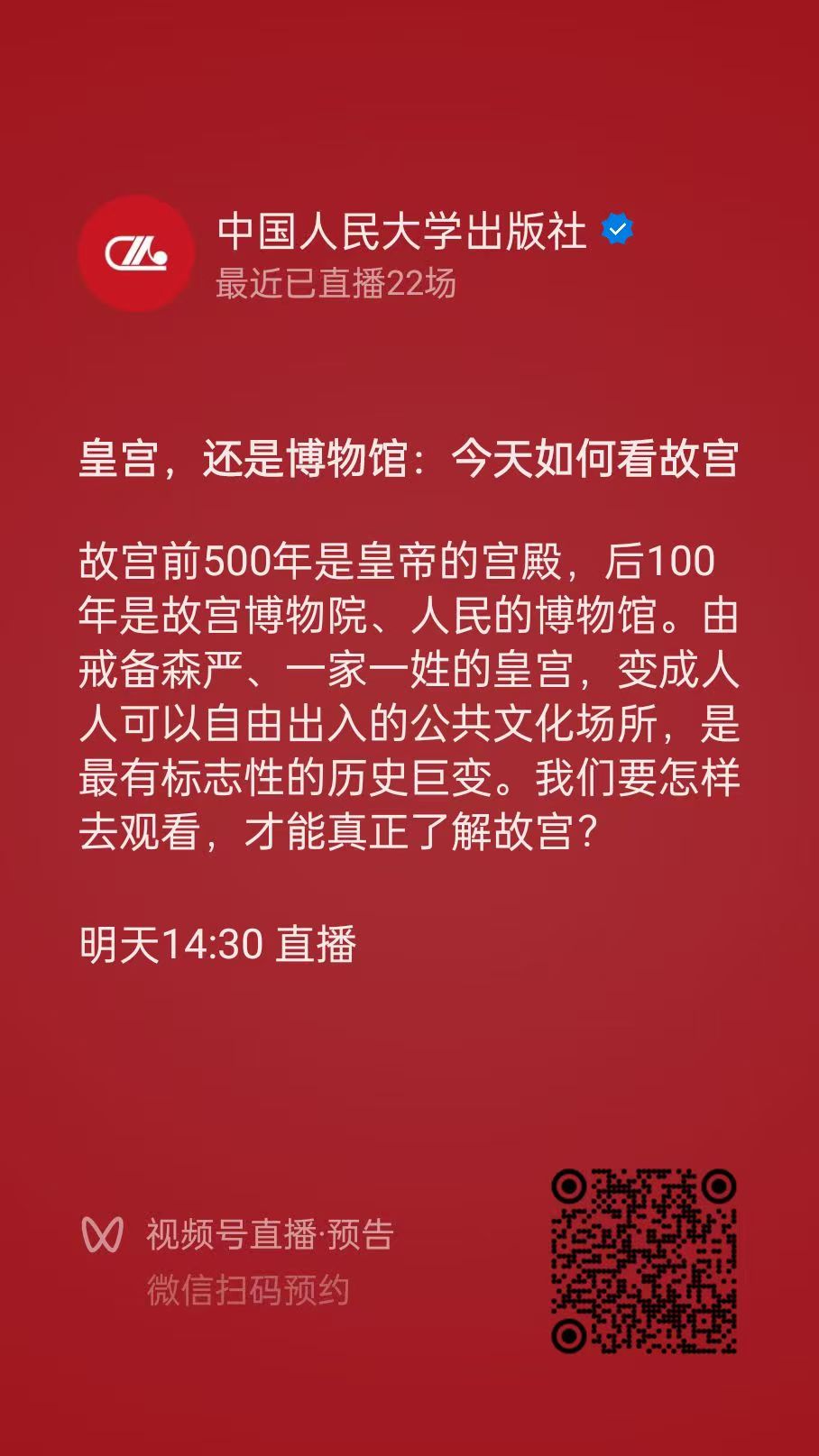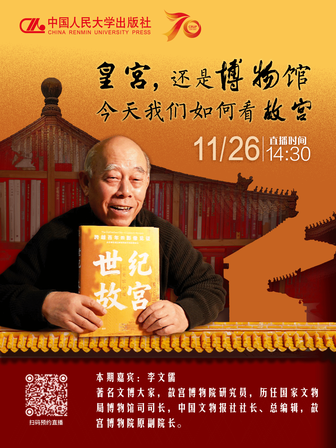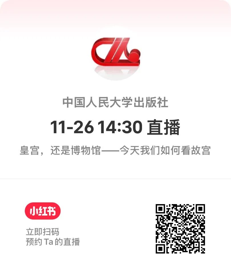 2025年11月26日14:30,故宫博物院原副院长将在直播间与读者分享“皇宫,还是博物馆——今天我们如何看故宫”。