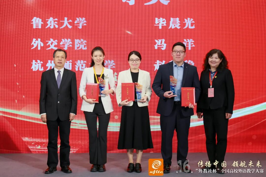 河北师范大学张森教授、上海外语教育出版社副总编辑王一佼为视听说课组三等奖获奖选手颁奖