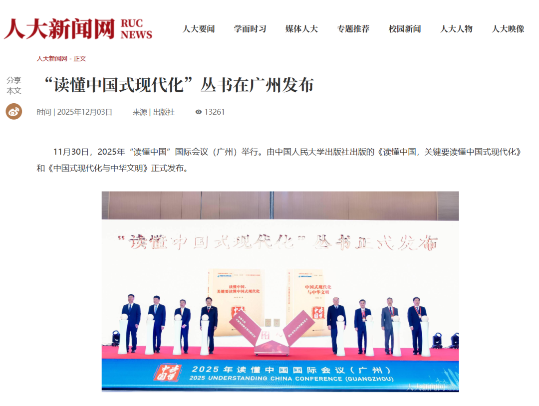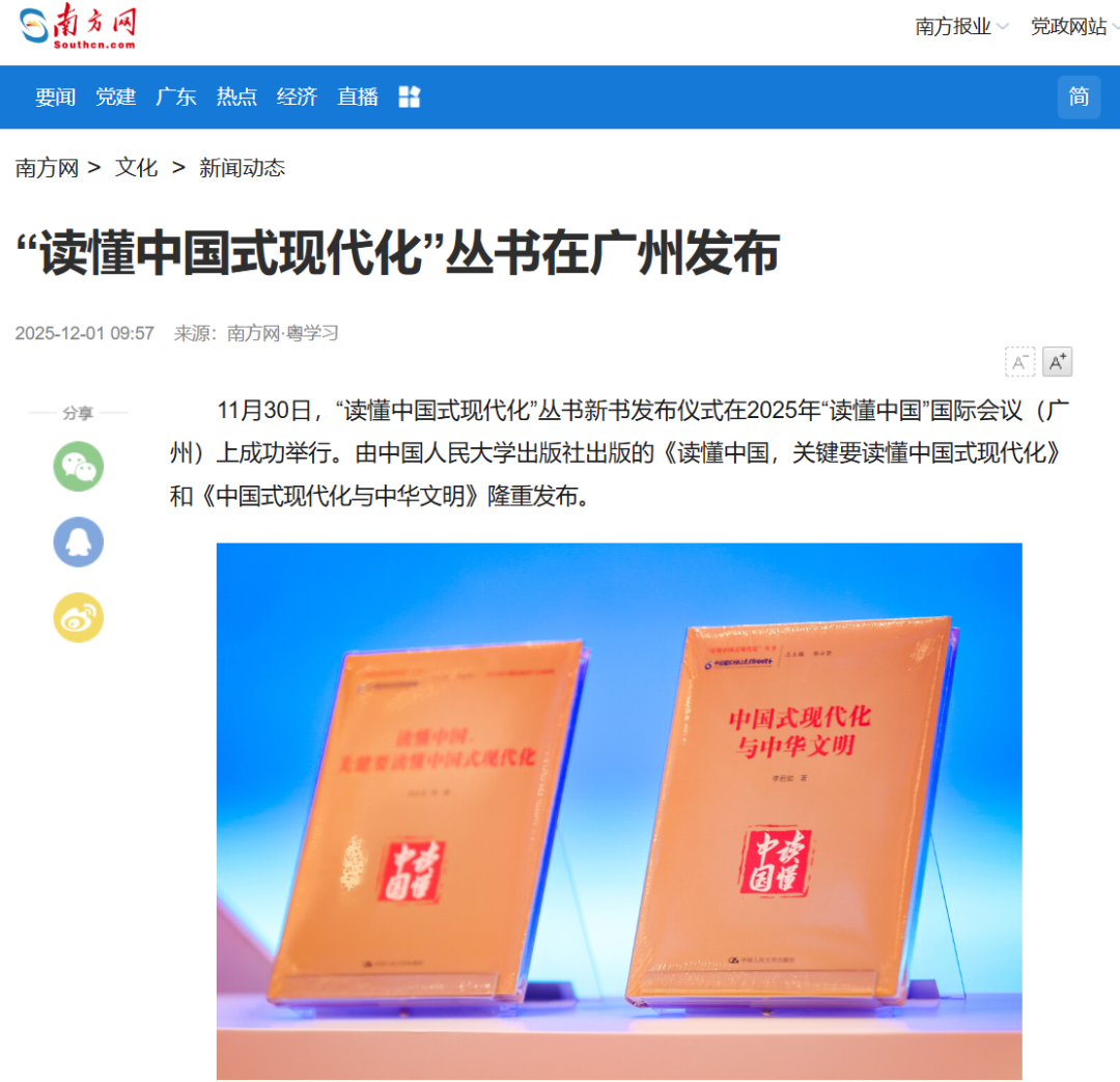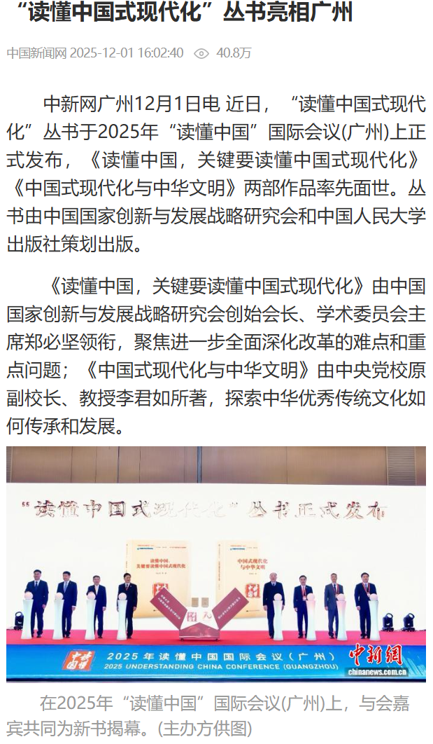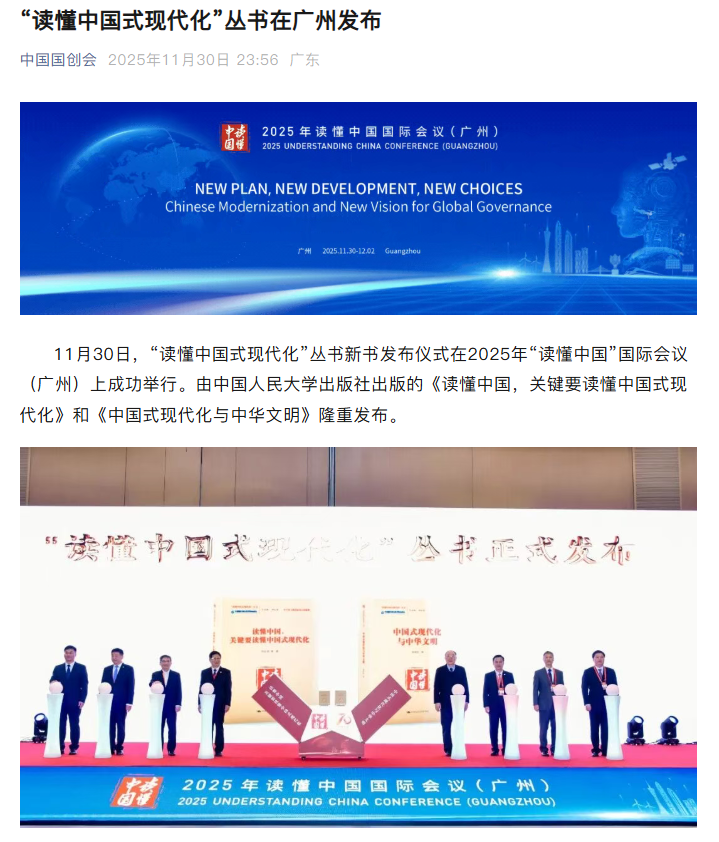 11月30日,“读懂中国式现代化”丛书新书发布仪式在2025年“读懂中国”国际会议(广州)上成功举行。由中国人民大学出版社出版的《读懂中国,关键要读懂中国式现代化》和《中国式现代化与中华文明》隆重发布。丛书发布后受到中国新闻网、中国新闻出版广电报、中国出版传媒网、广州日报、南方网等多家媒体关注。
