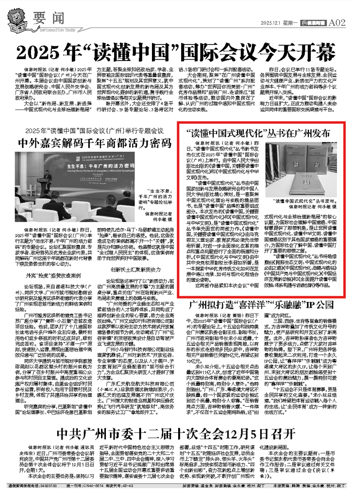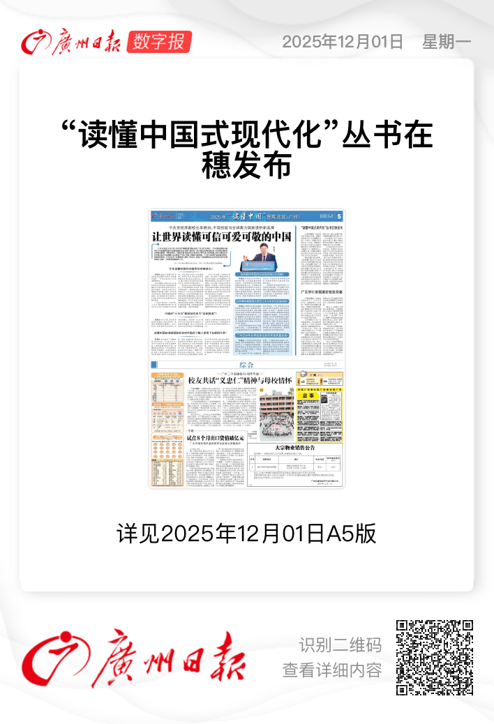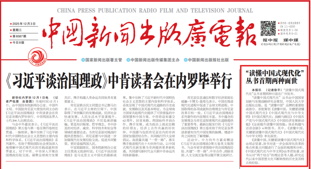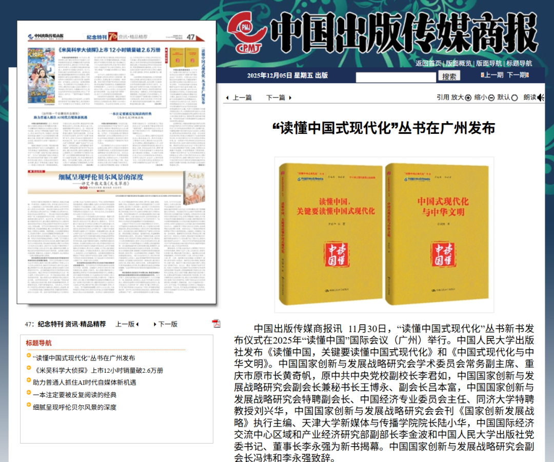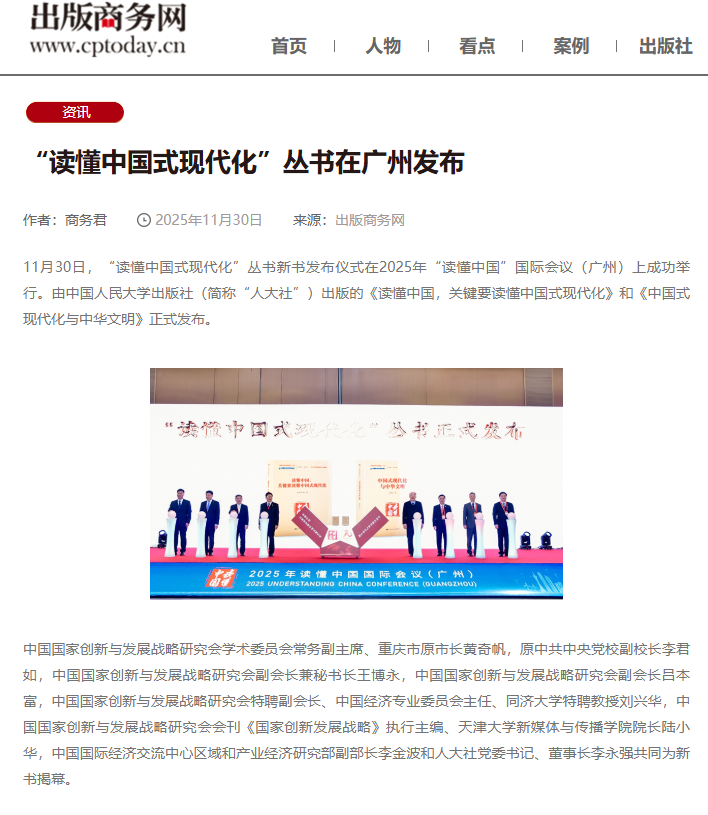 11月30日,“读懂中国式现代化”丛书新书发布仪式在2025年“读懂中国”国际会议(广州)上成功举行。由中国人民大学出版社出版的《读懂中国,关键要读懂中国式现代化》和《中国式现代化与中华文明》隆重发布。丛书发布后受到中国新闻网、中国新闻出版广电报、中国出版传媒网、广州日报、南方网等多家媒体关注。