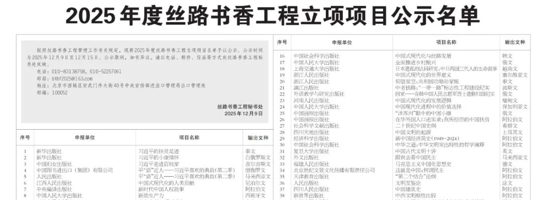 “丝路书香工程”是中国新闻出版业进入国家“一带一路”倡议的重大项目,旨在支持我国出版单位向“一带一路”共建国家输出中国优秀图书,推动体现国家意志、代表国家水准、传承中华文明、反映时代风貌、适于国际传播的优秀图书在“一带一路”沿线国家的翻译出版,以书为媒,充分发挥新闻出版在“一带一路”建设中的独特作用。2024年,学校出版社申报的张福锁院士等编写的著作《作物高产高效群体与关键生态因子的匹配及其调控》(葡萄牙文版)首次获得“丝路书香工程”立项资助,借鉴成功申报的经验,出版社再接再厉,于今年再次获得立项,不仅展示了出版社在选题规划、内容质量等方面的实力,也体现了其积极响应国家号召,推动中华文化海外传播的责任担当。