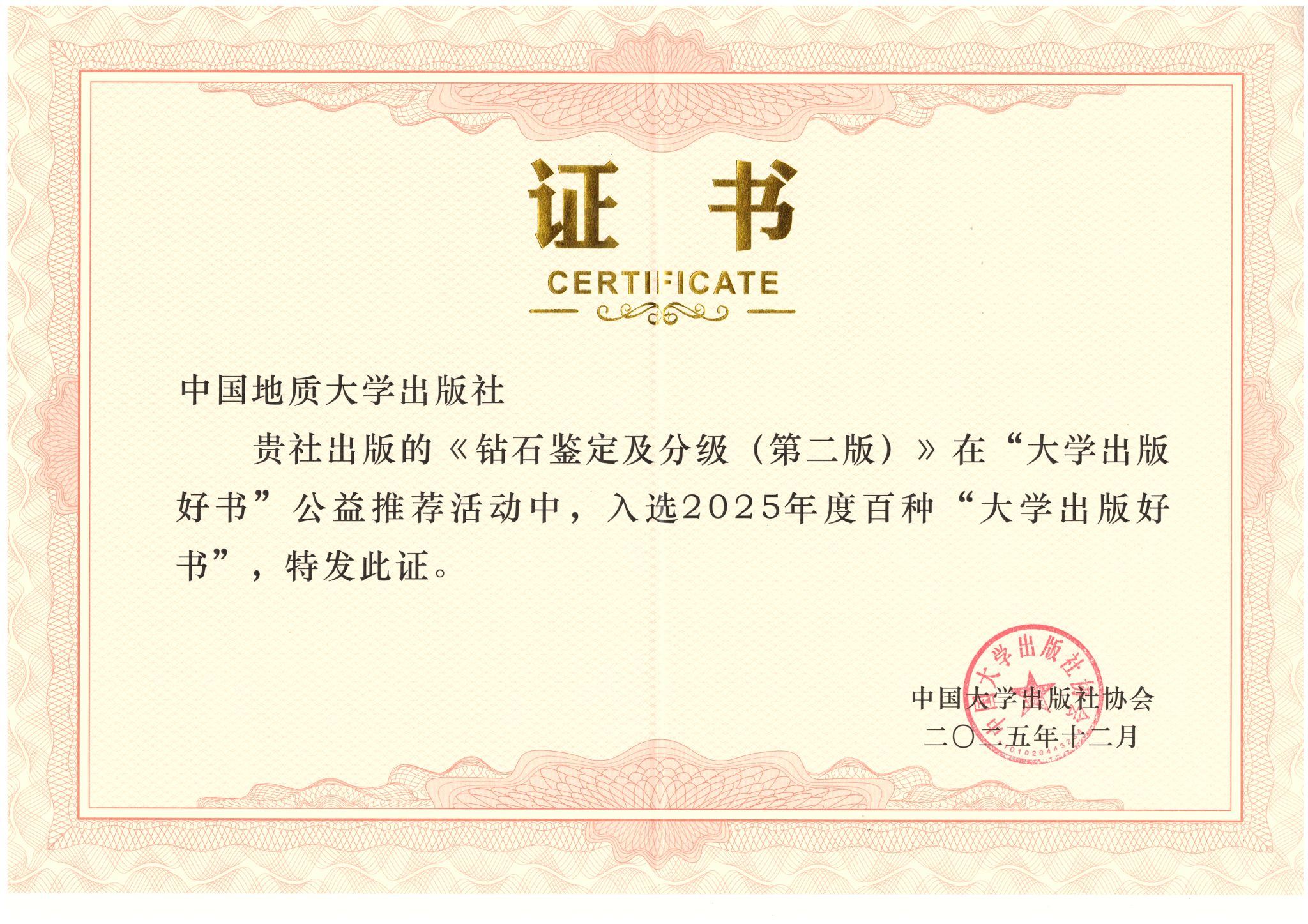 近日,中国大学出版社协会2025年度百种“大学出版好书”公益推荐结果正式揭晓,中国地质大学出版社出版的《钻石鉴定及分级(第二版)》(选题策划:张琰 龙昭月 作者:张晓晖 等)凭借扎实的专业内容、鲜明的实践特色与深厚的教育价值,成功入选高校教材类好书名单,为珠宝专业领域提供新的高质量学习参考。