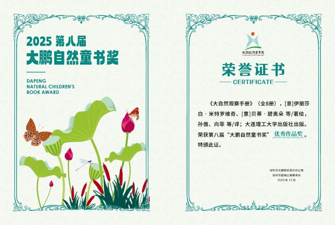 近日,第八届“大鹏自然童书奖”评选结果揭晓,在来自98家出版社/出版机构推荐的350种自然童书中,由大连理工大学出版社精心打造的青少年科普图书《大自然观察手册》荣获第八届“大鹏自然童书奖” 优秀作品奖。此前,该系列已成功入选“广东省2025-2026学年第一期中小学图书推荐目录”。此次入选是其在青少年自然教育与科学启蒙方面获得的又一重要认可。