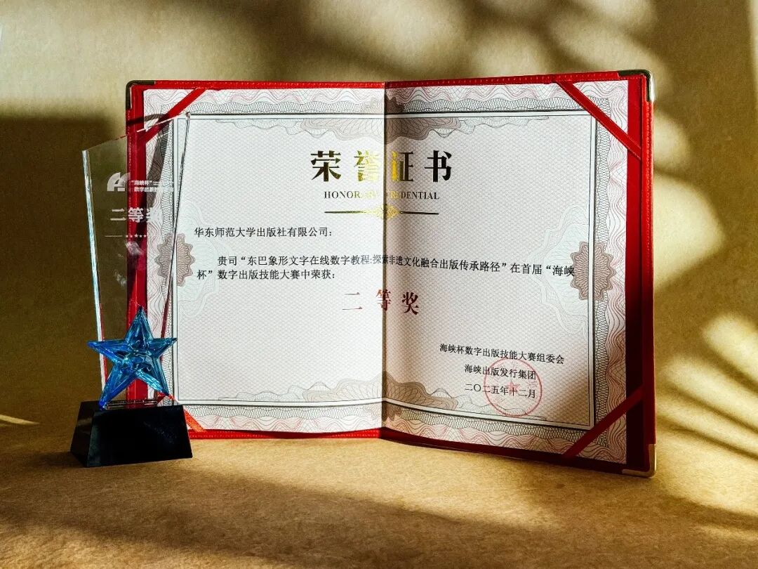 近期,首届“海峡杯”数字出版技能大赛颁奖典礼在福州举行。华东师范大学出版社的参赛作品“东巴象形文字在线数字教程:探索非遗文化融合出版传承路径”荣获专业赛道二等奖。