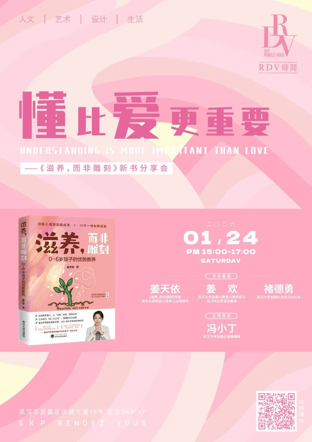 2026年1月24日(周六)15:00-17:00,清华大学积极心理学认证指导师姜天依、武汉大学发展与教育心理学硕士姜欢、武汉大学出版社北京分社社长褚德勇与武汉大学出版社营销编辑冯小丁一同做客武汉SKP 4F SKP RENDEZ-VOUS。期待与您一起,学习成为孩子生命的滋养者,而非人生的雕刻师。