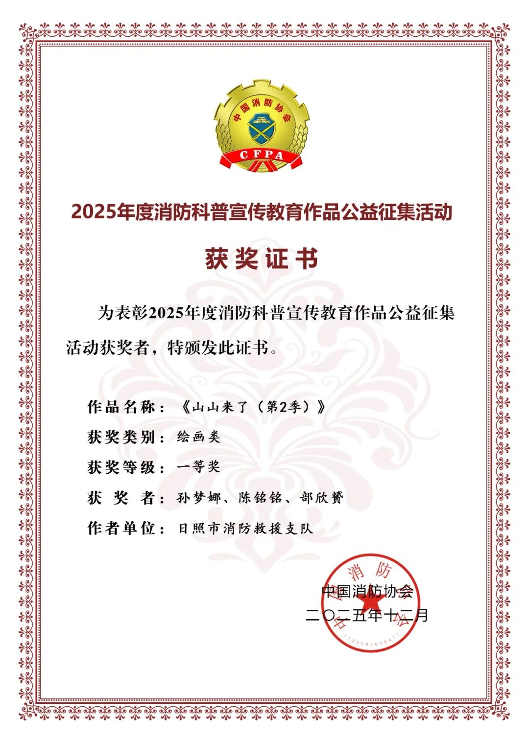 近日,中国消防协会发布《关于表彰2025年度消防科普宣传教育作品公益征集活动优秀组织单位和获奖作品的决定》。由山东消防协会推荐、中国海洋大学出版社出版的消防科普图书《山山来了(第2季)》,在全国优秀作品的激烈角逐中凭借专业且鲜活生动的内容荣获“2025年度消防科普宣传教育作品”一等奖。