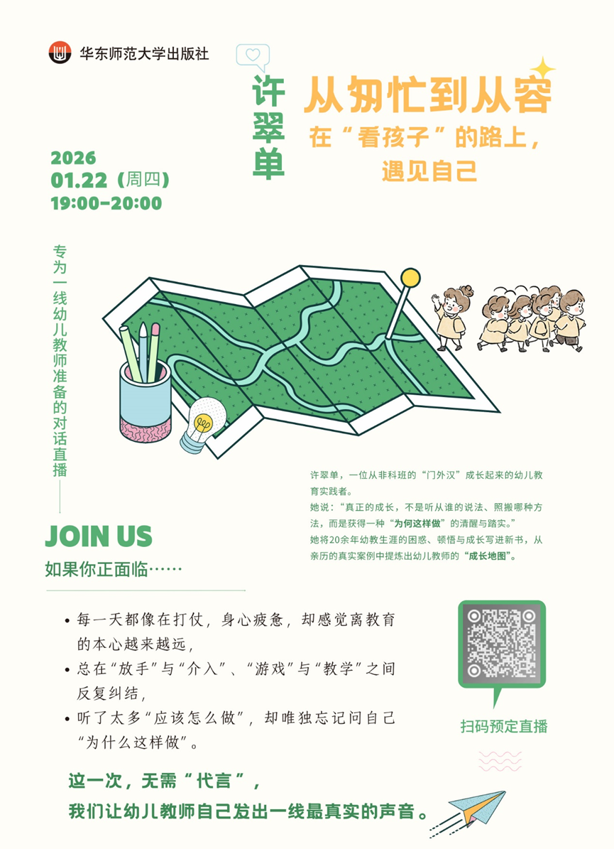 1月22日(周四)19:00,许翠单老师携新书《走在对的路上:一位幼儿教师在游戏中的成长》在直播间与你对话,聊聊幼儿教师的迷茫、成长与坚持,为你展开一幅“关于成长的、充满更多可能性的教育地图”,若你也在自己的路上跋涉与张望,愿这张地图能让你感到,在教育的旷野中,我们发出的光,曾经彼此映照。
