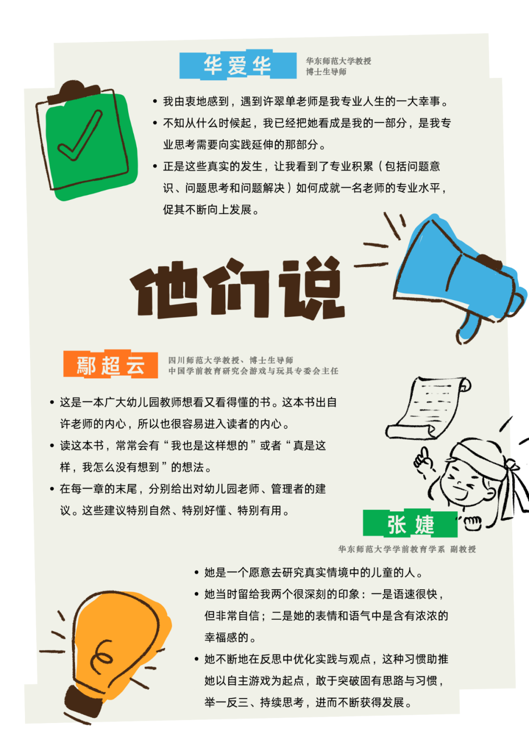 谁来说?许翠单,一位从非科班的“门外汉”成长起来的幼儿教育实践者,她,没有“高大上”的学历,完全是学前专业的“门外汉”从“我就想试试,因为我喜欢”开始,扎进幼儿教育一线20余年害怕犯低级错误,总担心别人说她不行苦干追赶,却发觉日常工作充满了无力与厌烦猛然惊觉:我们普遍埋头做了很多,却思考得太少!