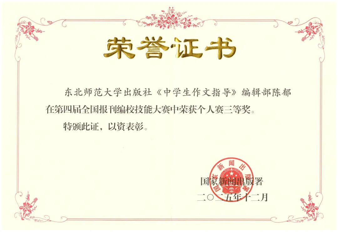 近日,由国家新闻出版署主办、中国新闻文化促进会承办的第四届全国报刊编校技能大赛决赛成绩揭晓。东北师范大学出版社编辑陈郁在全国340名参赛选手中表现突出,荣获个人赛三等奖,成为吉林省唯一摘得个人赛奖项的编辑。据了解,本届大赛个人赛设置一、二、三等奖,全国仅34人获奖。