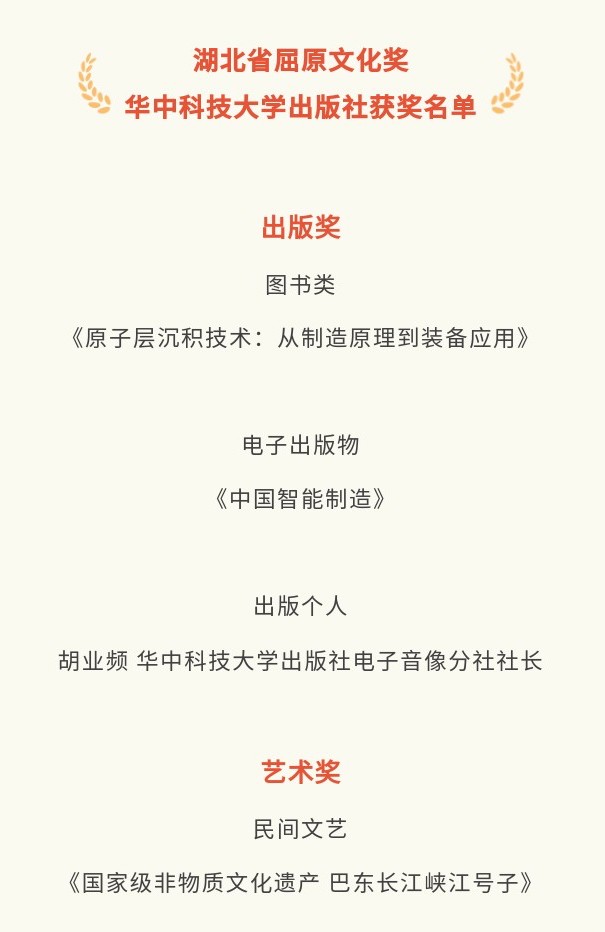 近日,湖北省屈原文化奖获奖名单结束公示,华中科技大学出版社3部作品获奖,1人获出版个人奖。其中,图书《原子层沉积技术——从制造原理到装备应用》及电子出版物《中国智能制造》获出版奖(原湖北出版政府奖图书奖),华中科技大学出版社电子音像分社社长胡业频获出版个人奖(原湖北出版政府奖编辑奖),《国家级非物质文化遗产 巴东长江峡江号子》获艺术奖(原湖北屈原文艺奖艺术奖)。屈原文化奖是经湖北省委、省政府批准设立的省级最高综合性文化奖项,旨在表彰彰显荆楚风格、代表湖北文化创作最高水平的优秀作品与人才。