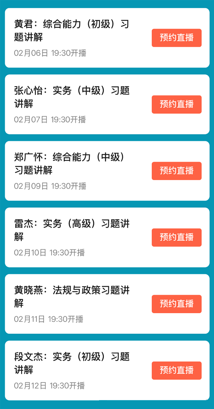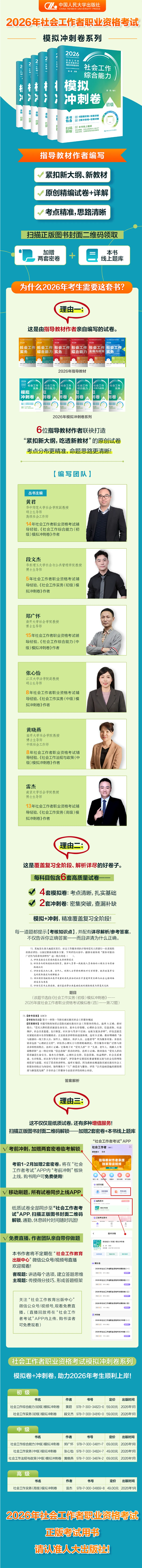 2月6日-12日,中国人民大学出版社特邀指导教材参编作者、“社会工作者职业资格考试模拟冲刺卷系列”6位作者:黄君、段文杰、郑广怀、张心怡、黄晓燕、雷杰为各位考生带来6场免费直播,深度讲解“社会工作者职业资格考试模拟冲刺卷”每个科目1套模拟卷。