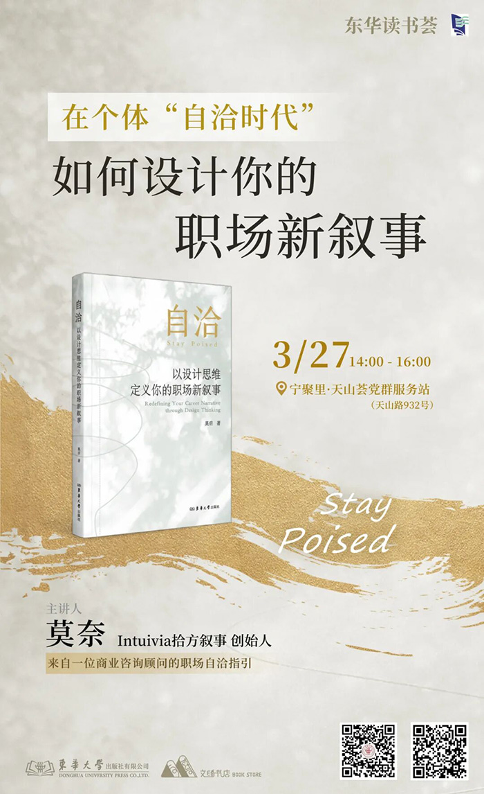 “在个体自洽时代,如何设计你的职场新叙事”主题讲座将于2026年3月27日14:00—16:00,在宁聚里·天山荟党群服务站(天山路932号)举行。本次讲座将围绕《自洽:以设计思维定义你的职场新叙事》一书的核心内容层层深入,深度解读职场智慧与现实需求,通过沉浸式互动环节,帮助职场人解锁自洽密码,重构属于自己的职场新叙事。