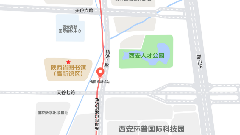 陕西省图书馆高新馆区(地址:西安市高新区天谷七路899号)。乘坐云巴到省图高新馆站,可在鱼化寨站与地铁三号线接驳,丈八四路站与地铁六号线接驳;或乘坐199路、118路、725路、198路、186路、828路、116路、272路、高新5号线,至云水一路天谷七路口站下车。