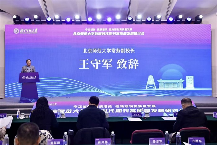王守军在致辞中指出,面对国家重大战略需要和学术出版深刻变革,北京师范大学持续深化期刊管理综合改革,于2023年整合资源成立期刊社。历经深耕实践,期刊社已成为支撑学校“双一流”建设、学科发展、科技创新的重要力量。他对期刊社的建设发展提出要求:一要抓牢导向,压紧压实主体责任,严格落实意识形态工作责任制;二要提升质量,推动更多期刊进入国内外知名数据库和权威期刊行列;三要加强统筹,建设全校统一的智能化公共服务平台,促进期刊资源共享和协同发展;四要建强队伍,着力培养一批懂出版、懂技术、懂管理的复合型办刊人才。他期待期刊社努力打造“国内一流、国际领先”的学术出版高地,为推动学术繁荣、提升北师大国际学术话语权作出新的更大贡献。