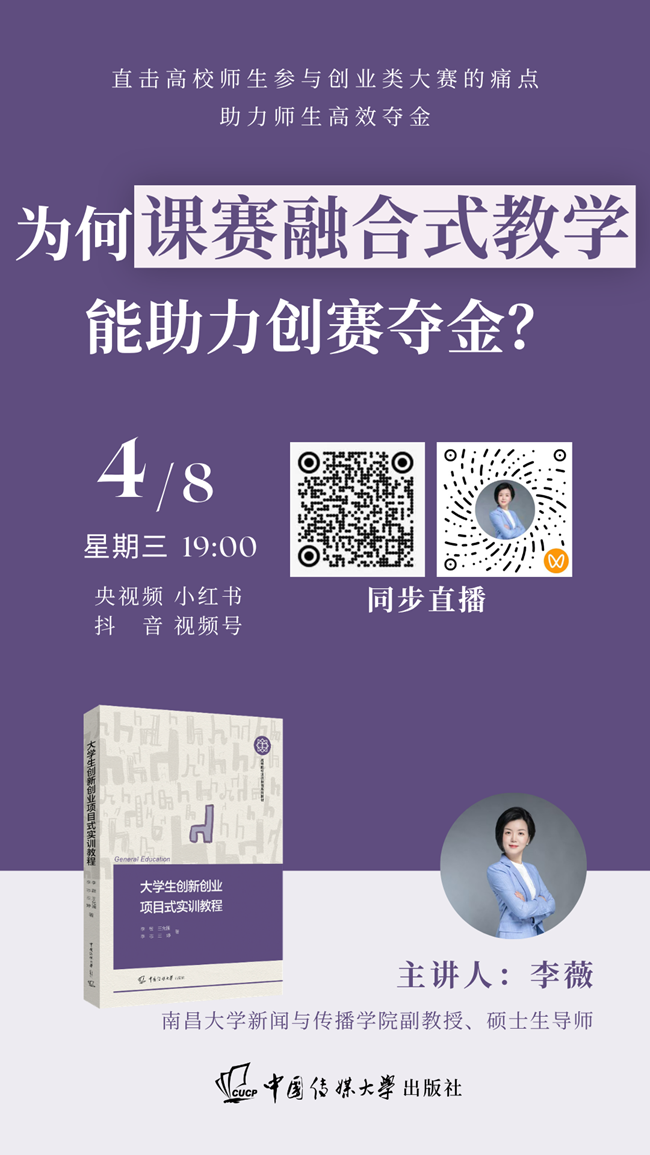 4月8日(星期三)19:00,南昌大学新闻与传播学院副教授,硕士生导师李薇将担任主讲人,为大家带来讲座——为何课赛融合式教学能助力创赛夺金?与观众分享大学生创新创业的相关内容。