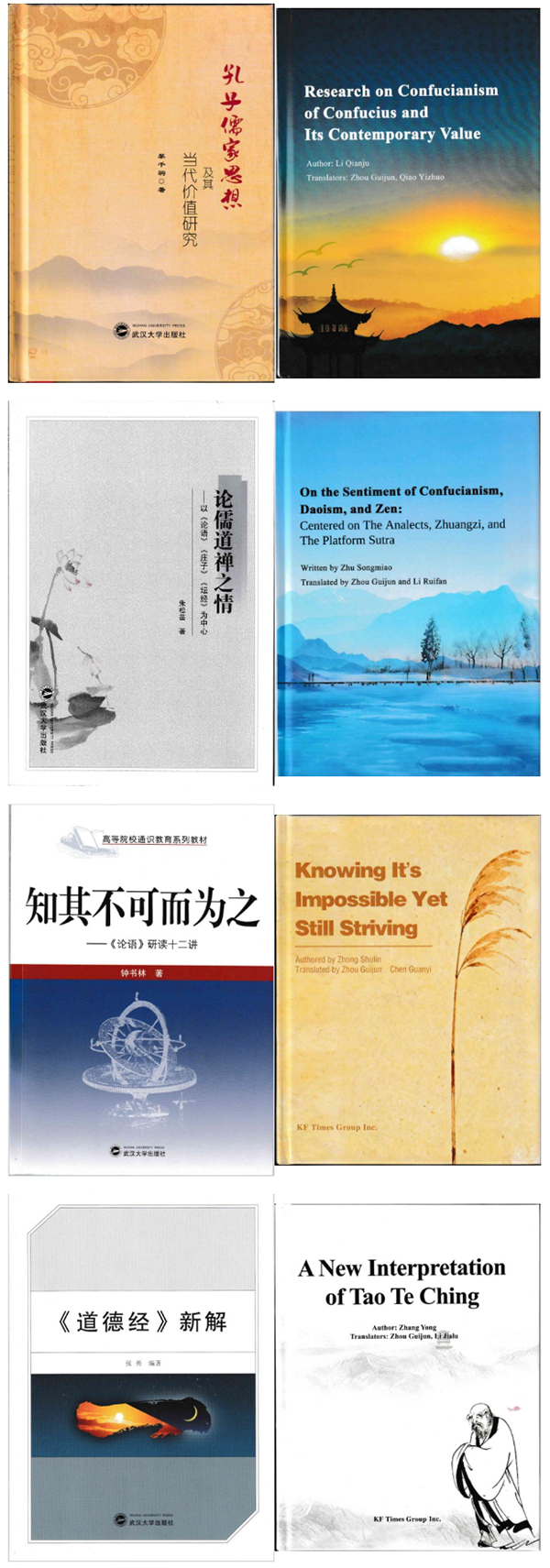 4种英文版著作分别为:黎千驹著《孔子儒家思想及其当代价值研究》、朱松苗著《论儒道禅之情》、钟书林著《知其不可而为之——<论语>研读十二讲》、张勇著《<道德经>新解》。4种原著是武汉大学出版社近年来在国学领域精心策划的重点学术精品,在学术界与读者中产生了良好反响。其中,《孔子儒家思想及其当代价值研究》系统梳理儒家思想内涵,探讨其当代价值;《论儒道禅之情》以“情”为切入点,贯通儒、道、禅三家哲学,揭示中华情感哲学的独特魅力;《知其不可而为之——<论语>研读十二讲》以十二个专题深度研读《论语》,呈现孔子人格精神;《<道德经>新解》结合现代语境对老子智慧作出新颖阐释。