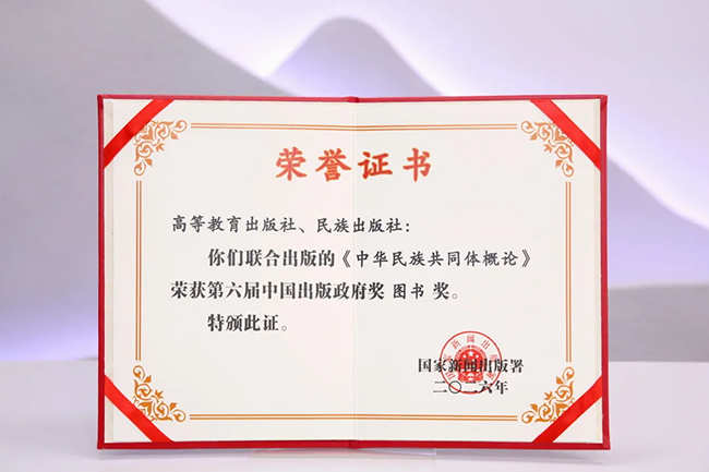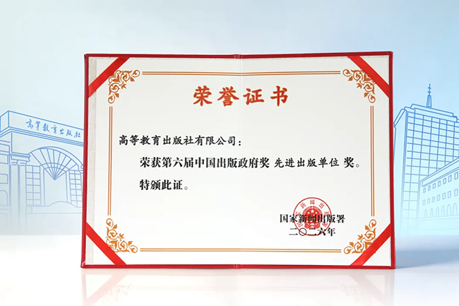 近日,国家新闻出版署公布第六届中国出版政府奖获奖名单。其中,高等教育出版社荣获先进出版单位奖,《中华民族共同体概论》荣获中国出版政府奖图书奖,《工程(英文)Engineering》荣获中国出版政府奖期刊奖,“智慧职教”平台荣获音像制品、电子出版物和网络出版物奖。