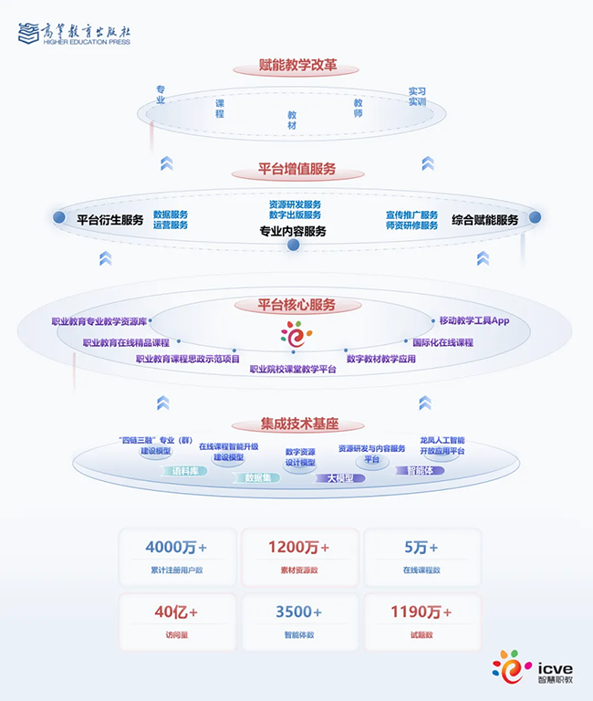 智慧职教(ICVE)由高等教育出版社建设运营,以服务国家教育数字化战略行动为使命,积极推进职业教育高质量发展。平台聚焦技术研发、资源制作、内容审核、应用服务等关键环节,以人工智能全面赋能教学新生态建设为基础,构建覆盖教、学、管、评、研全流程的服务体系,为职业院校量身打造数字化教学解决方案,持续推动职业教育教学改革创新。截至2026年3月,平台已汇聚7000余个专业(群)教学资源库、5万余门精品课程、1200余万条素材资源,注册用户超4000万个,平台累计访问量超40亿人次,在人才培养、技能提升、就业服务和产业支撑等方面发挥着重要作用。