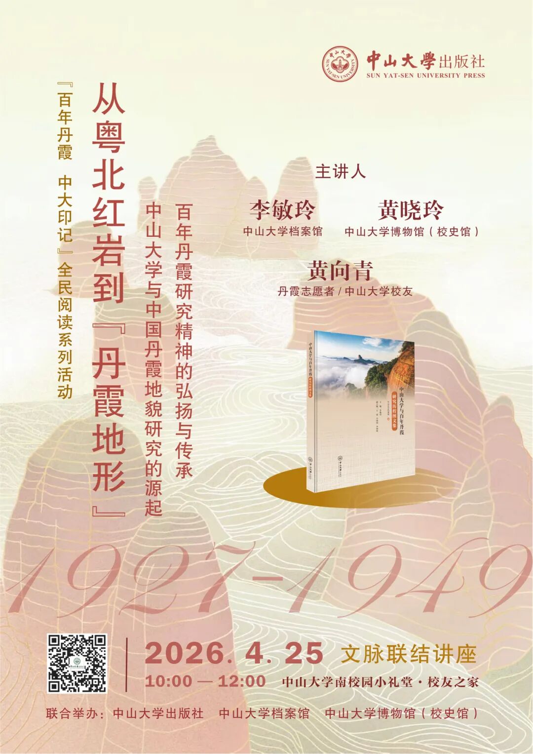 4月,中山大学出版社以阅读为核心纽带,融合校史、地理、生科、文博四大维度,让大众在阅读中读懂丹霞的科学价值与文化内涵,了解中大百年丹霞研究的峥嵘历程,讲好中大学人与丹霞的百年情缘故事,让丹霞研究的科研薪火与全民阅读的时代新风相融共生,推动丹霞自然文化遗产的传承与传播,让扎根大地的学术精神在书香中代代相传。