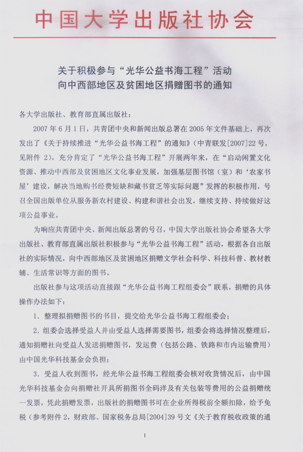 为响应共青团中央、新闻出版总署的号召,中国大学出版社协会希望各大学出版社、教育部直属出版社积极参与“光华公益书海工程”活动,根据各自出版社的实际情况,向中西部地区及贫困地区捐赠文学社会科学、科技科普、教材教辅、生活常识等方面的图书。