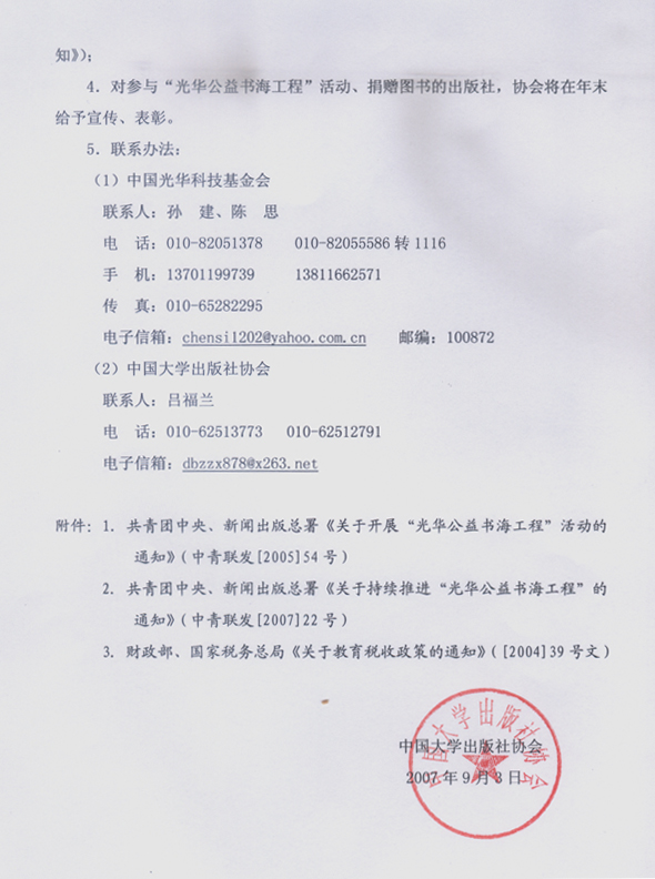 2.共青团中央、新闻出版总署《关于持续推进“光华公益书海工程”的通知》(中青联发[2007]22号)