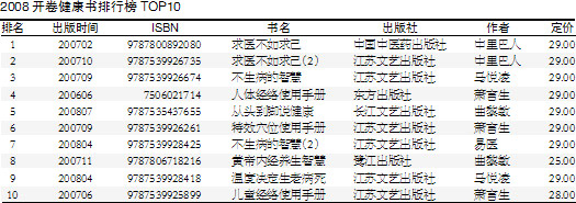 据开卷数据显示,2007年畅销的《求医不如求己》、《不生病的智慧》在2008年大众健康类图书中分别领跑第一和第三的位置。前十名的图书中依然是中里巴人、马悦凌、曲黎敏等“老”作者占主流,而且各自都有两本书同时上榜。萧言生的《人体经络使用手册》、《特效穴位使用手册》和《儿童经络使用手册》分别位于第四、第六和第十的位置,更是有三种书上榜。2008年的十大畅销健康书中几乎没有出现新的作者面孔。