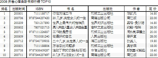2008年,心理自助类图书中,职场励志书仍是最主要的一部分。热销的机械工业出版社出版的《你在为谁工作》和《工作就是责任》、世界知识出版社推出的《世界上最伟大的推销员》等书,关注的无不是职场中人。