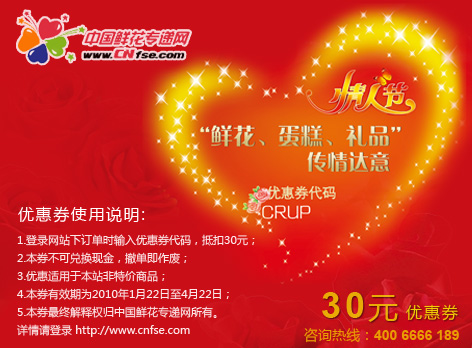 鲜花券使用说明:在中国鲜花专递网上下订单时,输入代金券上代码,即可减去对应金额;鲜花网代金券有效期为:2010年1月22日至2010年4月22日。